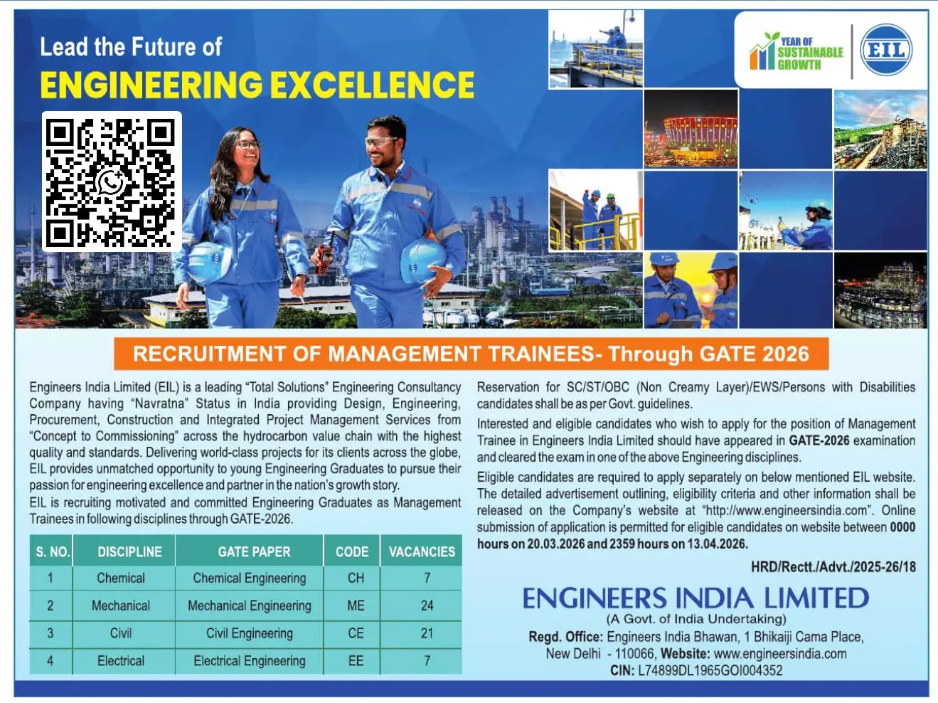 The EIL MT Recruitment 2026 Through GATE notification has been officially released by Engineers India Limited (EIL). This recruitment is a golden opportunity for engineering graduates who want to secure a high-paying PSU job through GATE 2026.