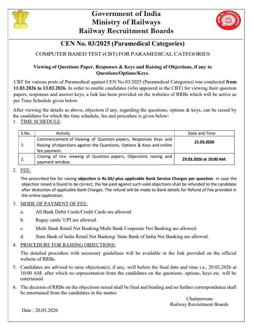 The RRB Paramedical Recruitment 2025 Answer Key has been officially released by the Railway Recruitment Boards (RRBs). Candidates who appeared in the Computer-Based Test (CBT) held on 11, 12, and 13 March 2026 can now check their response sheet along with the provisional answer key.